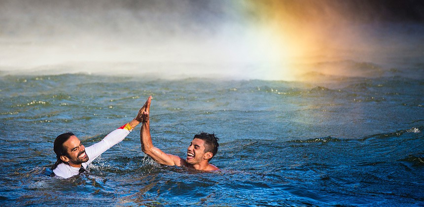 Second day was the most important as Orlando and Jonathan were diving from a 30-meter cliff. Here you need to be ready as they don't dive from such heights very often. Looking at the waterfall, I decided to stay on the left side to get them on the water so that they would be really visible. If you get them on the rock, you barely see them or you need to look really closely to find the diver. I was lucky with the light and caught a little bit of rainbow in my photo. I was really happy with the result despite the fact that Jonathan jumped once from 30 meters and Orlando jumped three times!